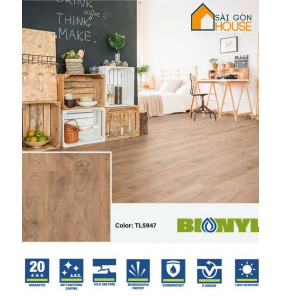 - Sàn gỗ Binyl rất bền màu, có khả năng chống ánh sáng mặt trời, tức là ngay cả khi tiếp xúc với ánh sáng mặt trời trong thời gian dài.